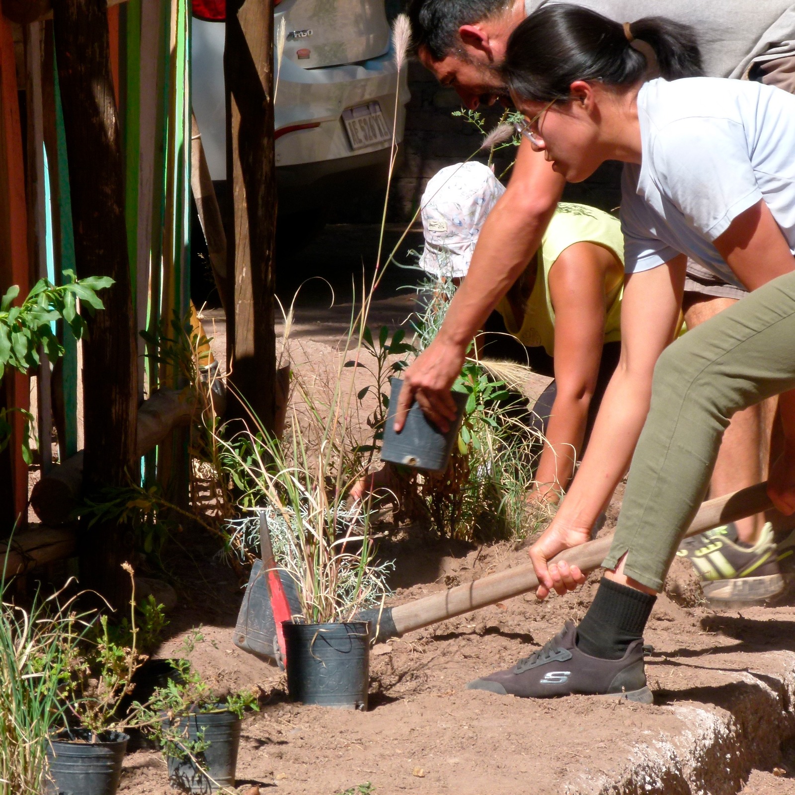 El proceso de conocer y transformar este paisaje tuvo diferentes momentos: la discusión con las infancias, recabar la opinión de las familias a través de encuestas gráficas, trabajar con estudiantes de la facultad en el diseño paisajístico del espacio y poner manos a la obra. Durante el primer año produjimos plantines de especies nativas, instalamos un sistema de riego, plantamos y sembramos. Fueron sumándose voluntades como empresas y particulares que donaron materiales y plantas, y muchas familias con su trabajo durante los fines de semana.